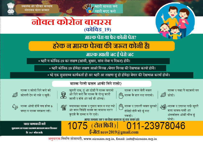 • खुदगी नास, मूं अर ठोडी पै मास्‍क लगावो अर निगे करो कि मास्‍क कै दोन्‍यू कानी खाली न होवे अर सई सी आज्‍या।